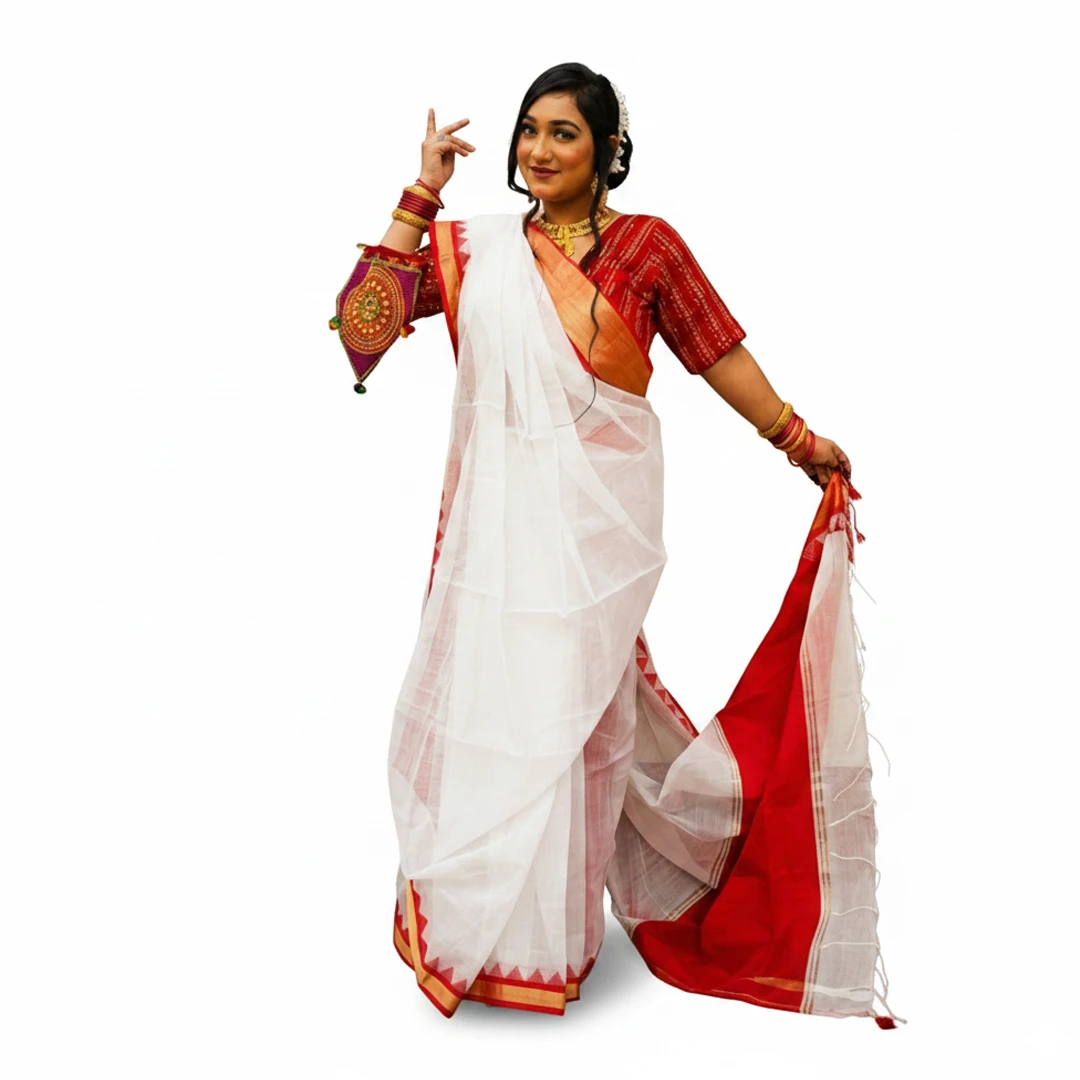 Crafted with the traditional Laal-Paar (Red Border) combination that is synonymous with celebratory joy, this Tant cotton saree features an elegant, subtle sheer texture. The pristine white body is anchored by a bold, deep red border that is richly adorned with exquisite golden zari work. This opulent gold detail catches the light, adding a majestic shimmer that transitions from daytime ceremonies to evening festivities. Lightweight and graceful, this saree is designed to ensure you embody classic charm while celebrating with comfort.