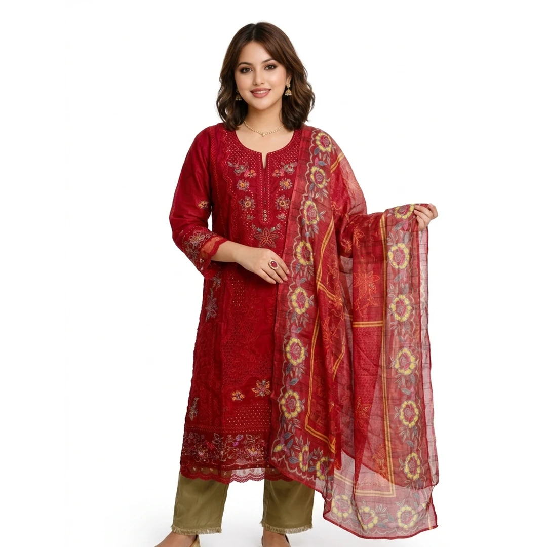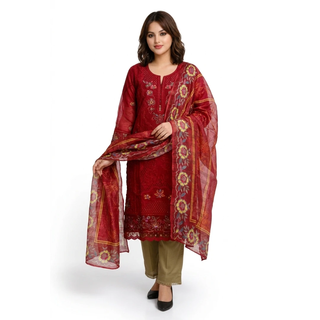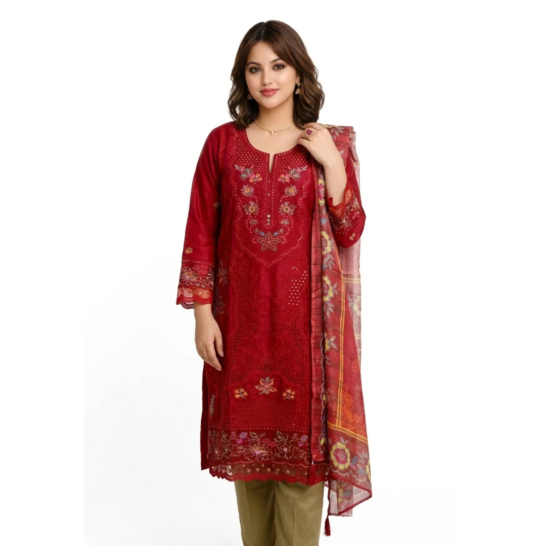 This set features a beautifully structured kurta in a deep, radiant crimson, adorned with intricate, tonal threadwork that adds subtle texture and luxury. The delicate floral patterns on the yoke and bodice provide a classic, feminine touch.