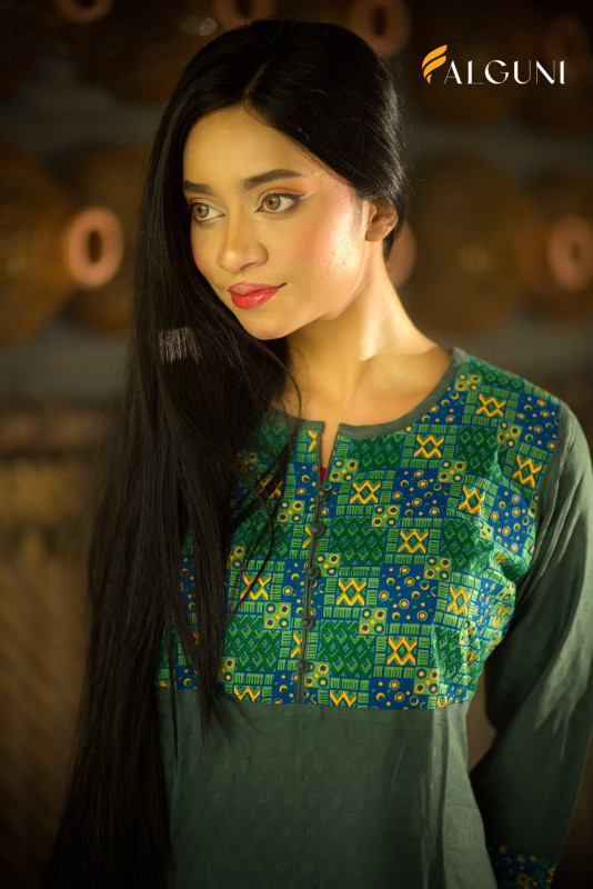 This elegant green kurti features a beautiful, patterned yoke in a vibrant mix of blue and yellow, adding a pop of color and modern style. The body of the kurti has a subtle, self-textured pattern that complements the design without overpowering it.