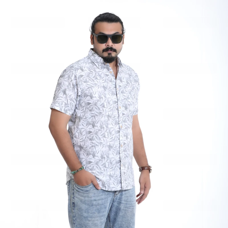 Step into the season with this stylish and breezy short-sleeve printed shirt. Featuring a modern leaf or tropical pattern in shades of white and grey, this button-down shirt is the perfect way to add a fresh, casual look to your wardrobe. Made from a lightweight and breathable fabric, it's designed for all-day comfort. Pair it with jeans or shorts for a relaxed weekend look or a stylish vacation outfit.