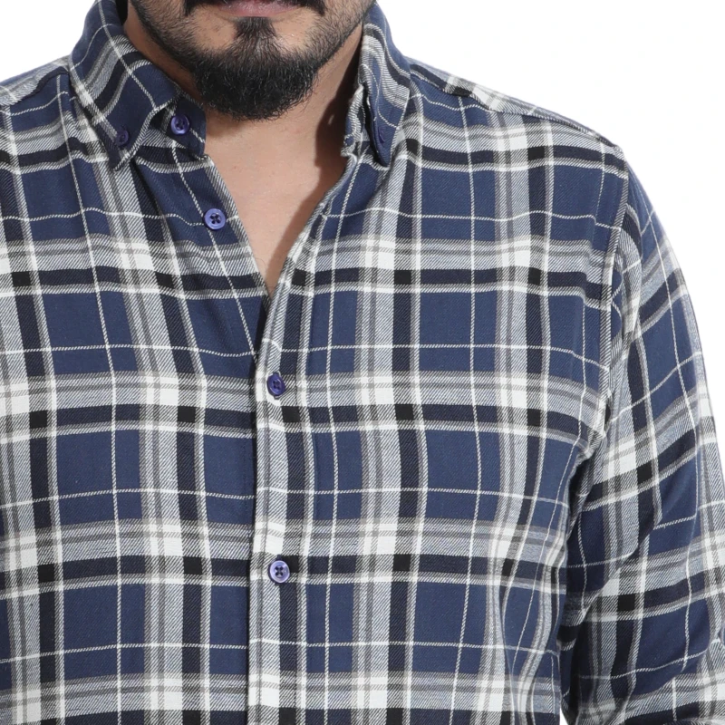 Men's Classic Navy Blue Plaid Checkered Long Sleeve Shirt