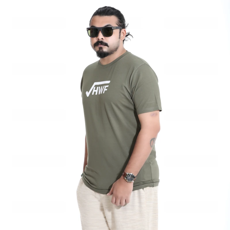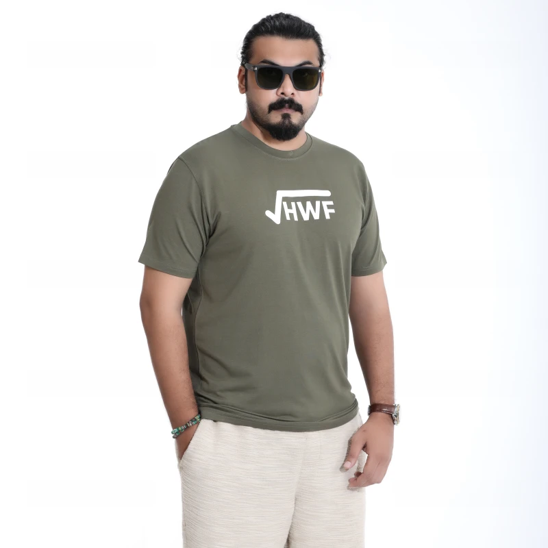 Elevate your casual style with this comfortable and trendy olive green t-shirt. Made from a soft, breathable cotton blend, this tee features a bold "HWF" graphic print on the front, adding a touch of urban edge to your everyday look. The classic crew neck and regular fit ensure maximum comfort and versatility. Perfect for pairing with jeans, shorts, or joggers, this t-shirt is ideal for casual outings, weekend adventures, or just relaxing at home. Its durable fabric and quality print are designed to last, making it a staple in your wardrobe.