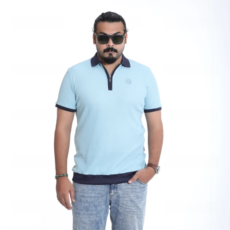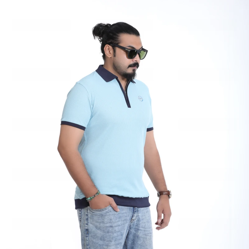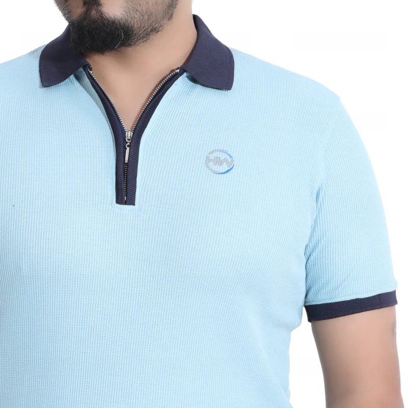 Men's Textured Sky Blue Polo with Zip-Up Collar T-Shirt
