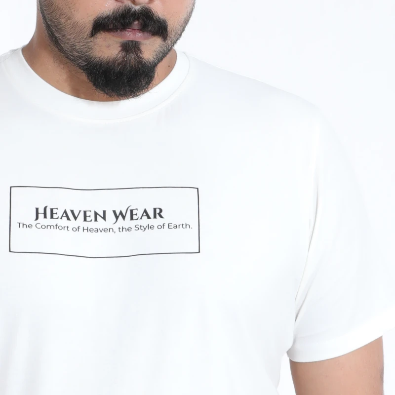 Achieve a clean, contemporary look with this minimalist white graphic T-shirt. Made from soft, breathable cotton, this tee ensures all-day comfort. The classic crew neck and short sleeves are highlighted by a subtle, boxed text print on the chest, featuring "HEAVEN WEAR" for a touch of refined branding.