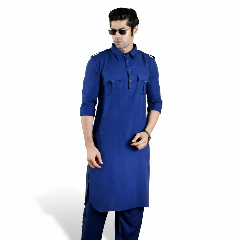 Step up your fashion game with this contemporary Royal Blue Kabli Set, blending traditional roots with a modern, utility-inspired aesthetic. Featuring structured chest pockets and a crisp collar, this look is bold, sharp, and perfect for the man who wants a standout ethnic outfit.