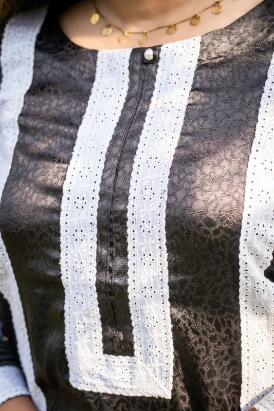 This striking black kurti is a perfect blend of modern and traditional style. The rich black fabric has a subtle, self-textured pattern that adds depth and visual interest. The standout feature is the bold white lace detailing that frames the neckline and runs down the front in two distinct stripes, creating a sophisticated and slimming effect. The three-quarter sleeves are also accented with matching white lace cuffs, tying the whole look together.