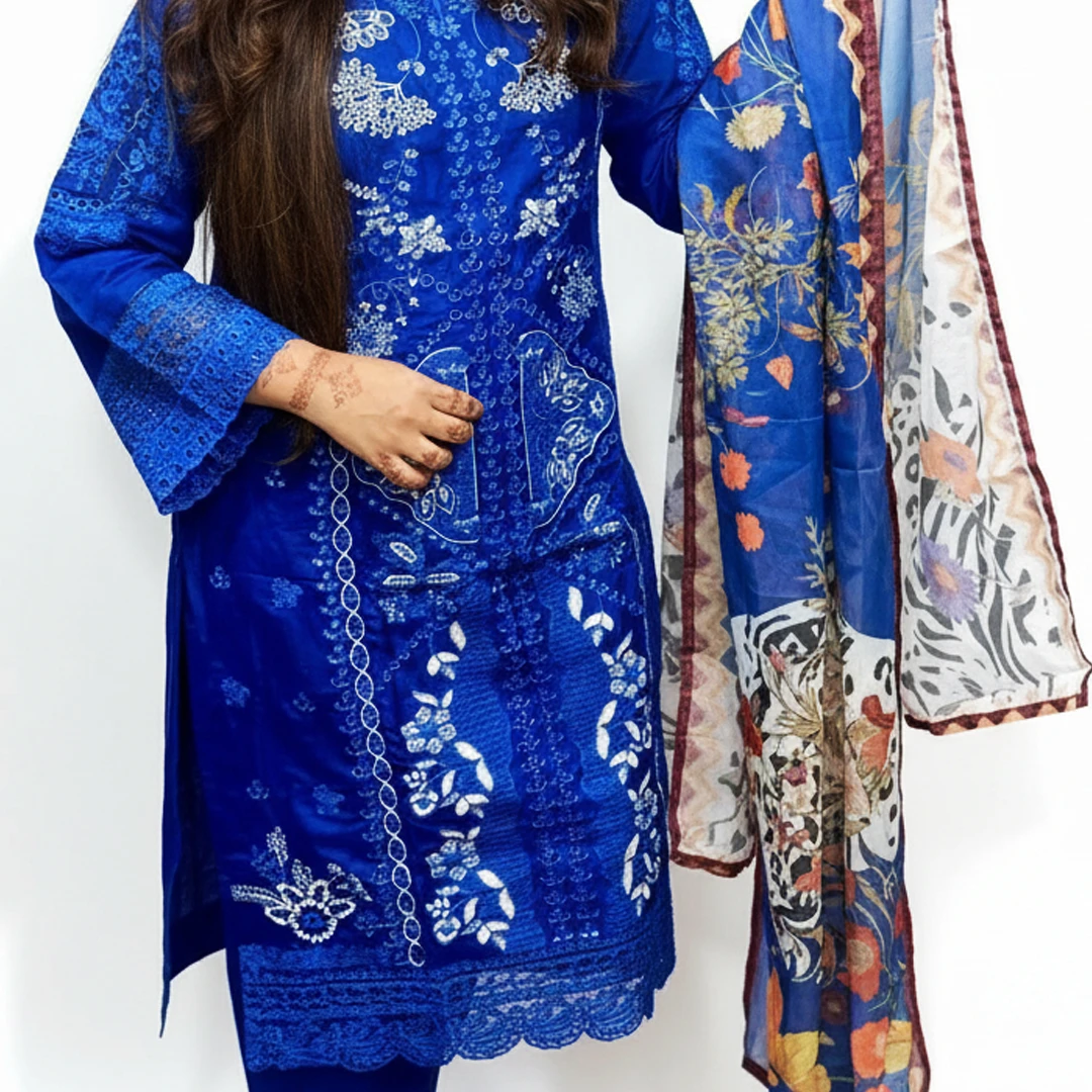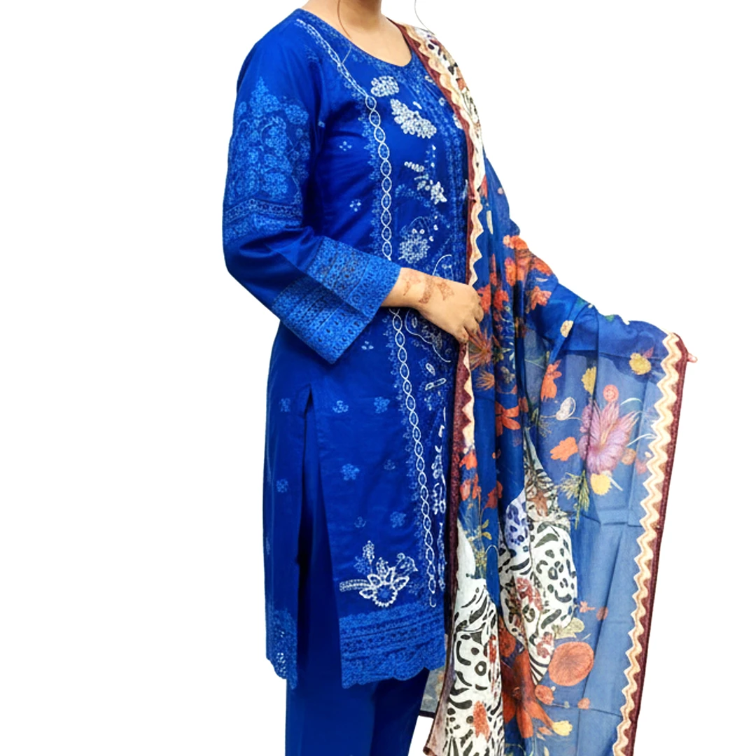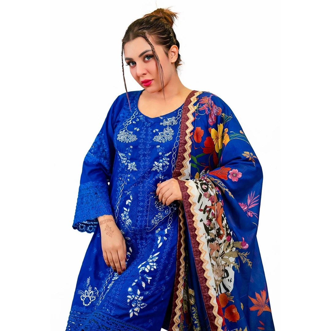 পিওর কটন ড্রেসের ওপর প্রিমিয়াম কোয়ালিটির অল ওভার এমব্রয়ডারি ড্রেসটির গলার অংশে এবং নিচের প্যানেলে রয়েছে হেভি হাই-কোয়ালিটি এমব্রয়ডারি কাজ। ওড়নাটি ফ্লোরাল প্রিন্ট এবং বর্ডারে লেইস এর কাজ।