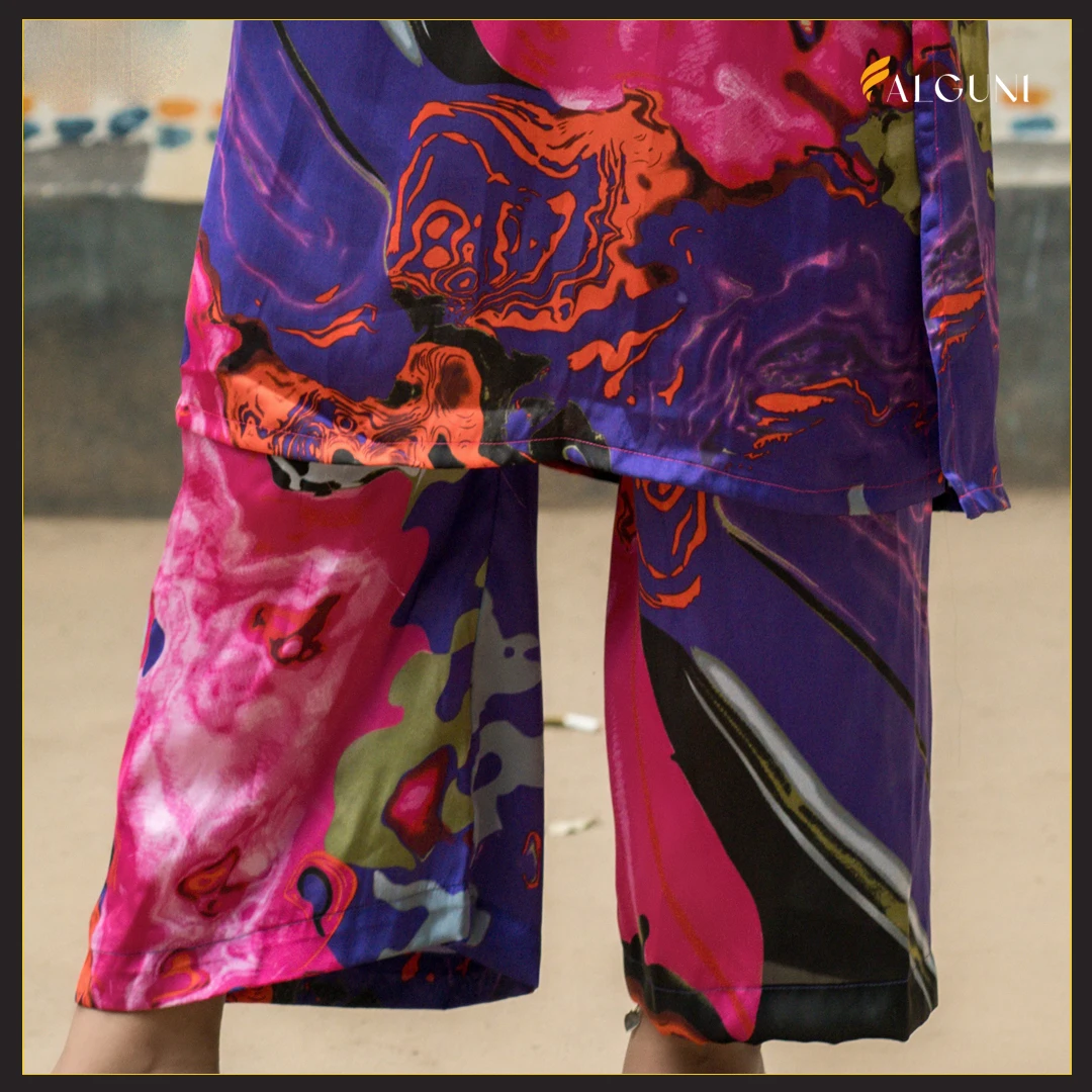 Make a striking style statement with this eye-catching T-Guni Co-Ord set, featuring a vibrant and bold abstract print. This two-piece ensemble includes a chic tunic-style top with a band collar and a partial button placket, perfectly matched with comfortable straight-leg or relaxed-fit pants. The rich mix of pink, purple, blue, and orange hues creates an artistic, fluid design that's perfect for casual outings, festive events, or adding a pop of color to your everyday wardrobe. Crafted from a smooth, lightweight fabric, this set offers both comfort and undeniable style.