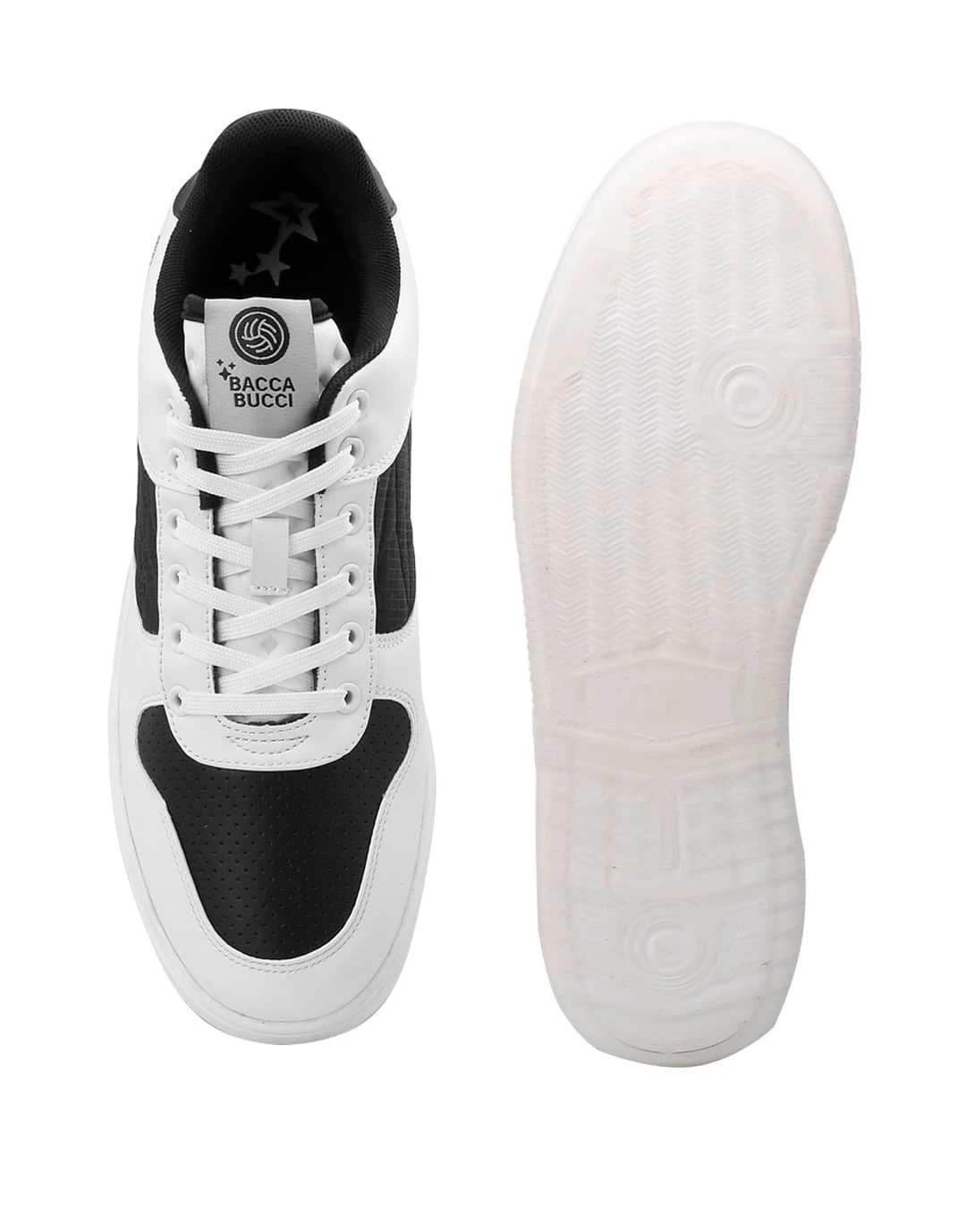 "Discover the perfect blend of style and comfort with the BACCA BUCCI Men's Black & White Casual Sneakers. Engineered for the fashion-forward individual, these sneakers boast a crisp black and white palette, accented by textural variations including subtle perforations and sleek lines. The secure lace-up closure ensures a snug fit, while the robust sole provides excellent traction and support. Whether you're hitting the streets or simply seeking a versatile pair of shoes for your casual wardrobe, these BACCA BUCCI sneakers promise effortless style and comfort from dawn till dusk."