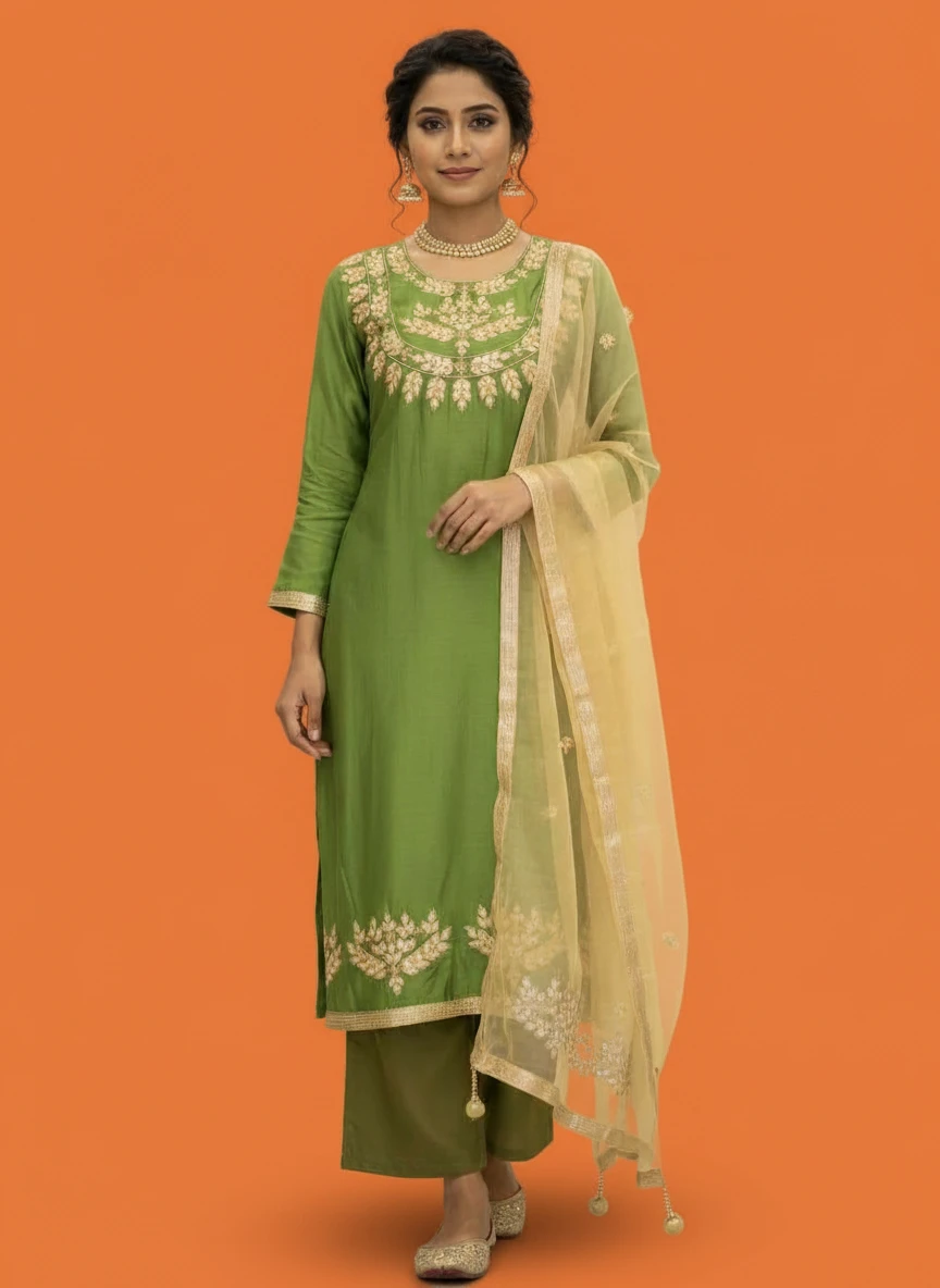 Elegant Lime Green Embroidered Semi-Stitched Premium Rayon Three-Piece