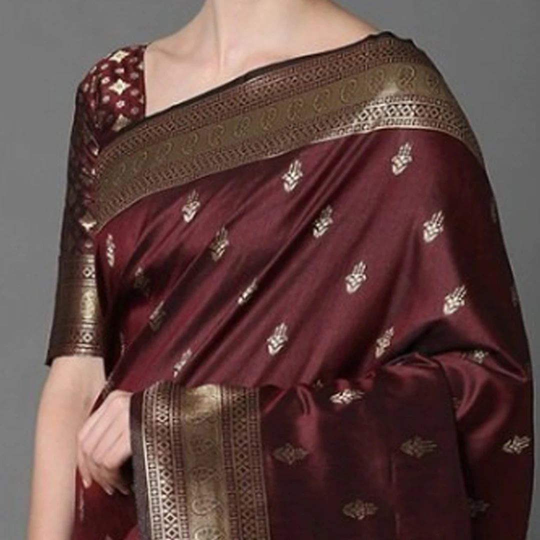 Drape yourself in timeless elegance with this exquisite maroon Banarasi silk-blend saree. Adorned with a rich gold woven border and an intricately patterned pallu, this saree captures the essence of traditional craftsmanship with a touch of modern sophistication. The body of the saree features subtle woven motifs, enhancing its luxurious appeal. Crafted from a soft, lustrous silk-blend fabric, it drapes beautifully and offers a comfortable feel, making it perfect for weddings, festive occasions, and grand celebrations. It comes with an unstitched blouse piece in a matching maroon with complementary gold weaving, allowing for a personalized fit.