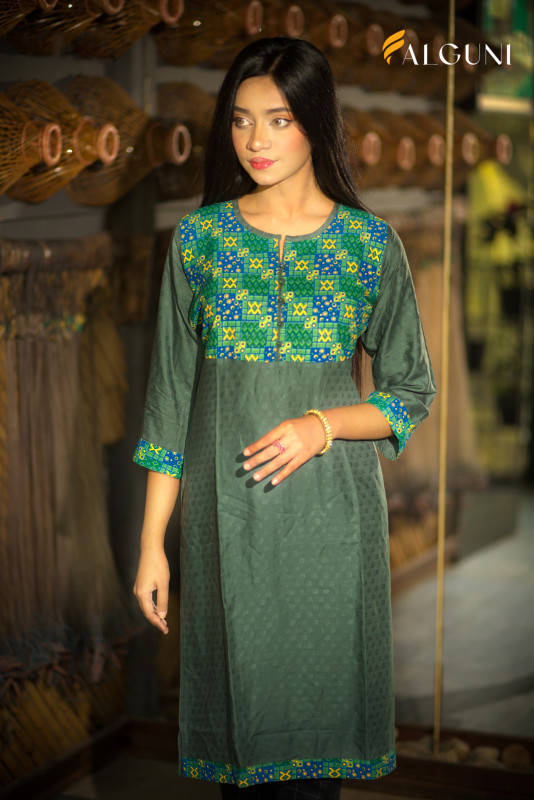 This elegant green kurti features a beautiful, patterned yoke in a vibrant mix of blue and yellow, adding a pop of color and modern style. The body of the kurti has a subtle, self-textured pattern that complements the design without overpowering it.