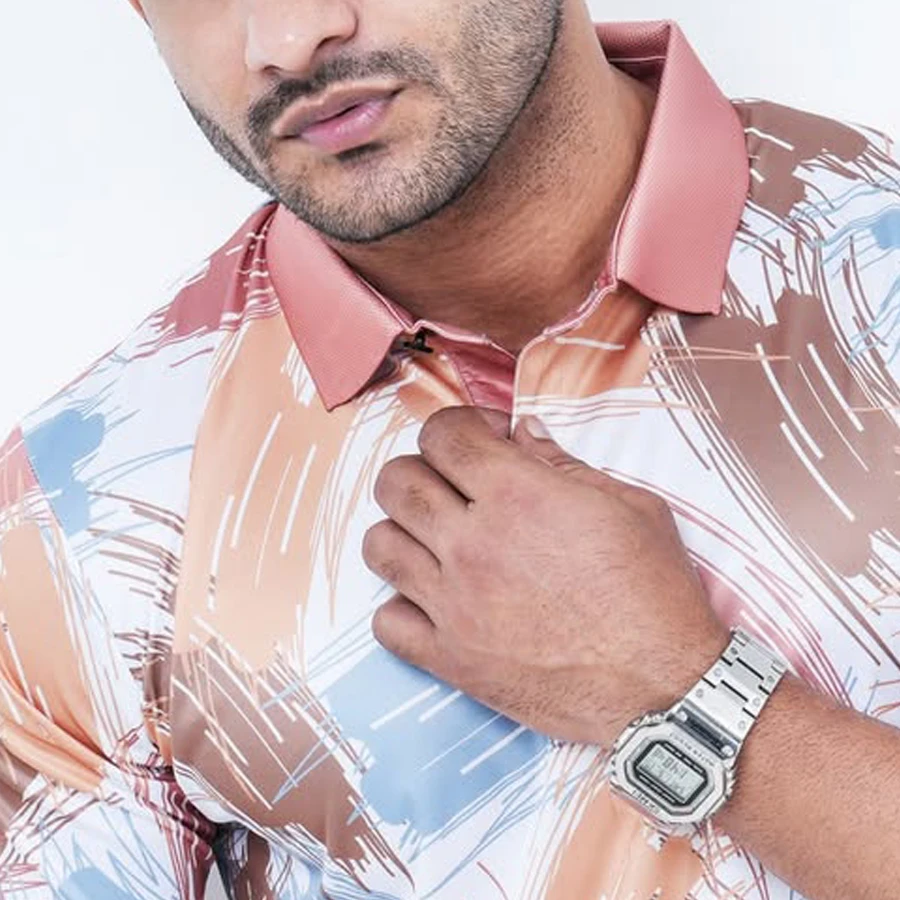 "Redefine your casual wardrobe with our Men's Abstract Brushstroke Print Polo T-Shirt. This stylish polo features a unique, modern abstract pattern in a blend of earthy tones like rust, light blue, peach, and white, making it a standout piece. Crafted from a comfortable, breathable fabric, it's perfect for all-day wear, whether you're hitting the golf course, meeting friends, or just enjoying a relaxed day out. The classic polo collar in a contrasting peach/pink hue adds a sophisticated touch.