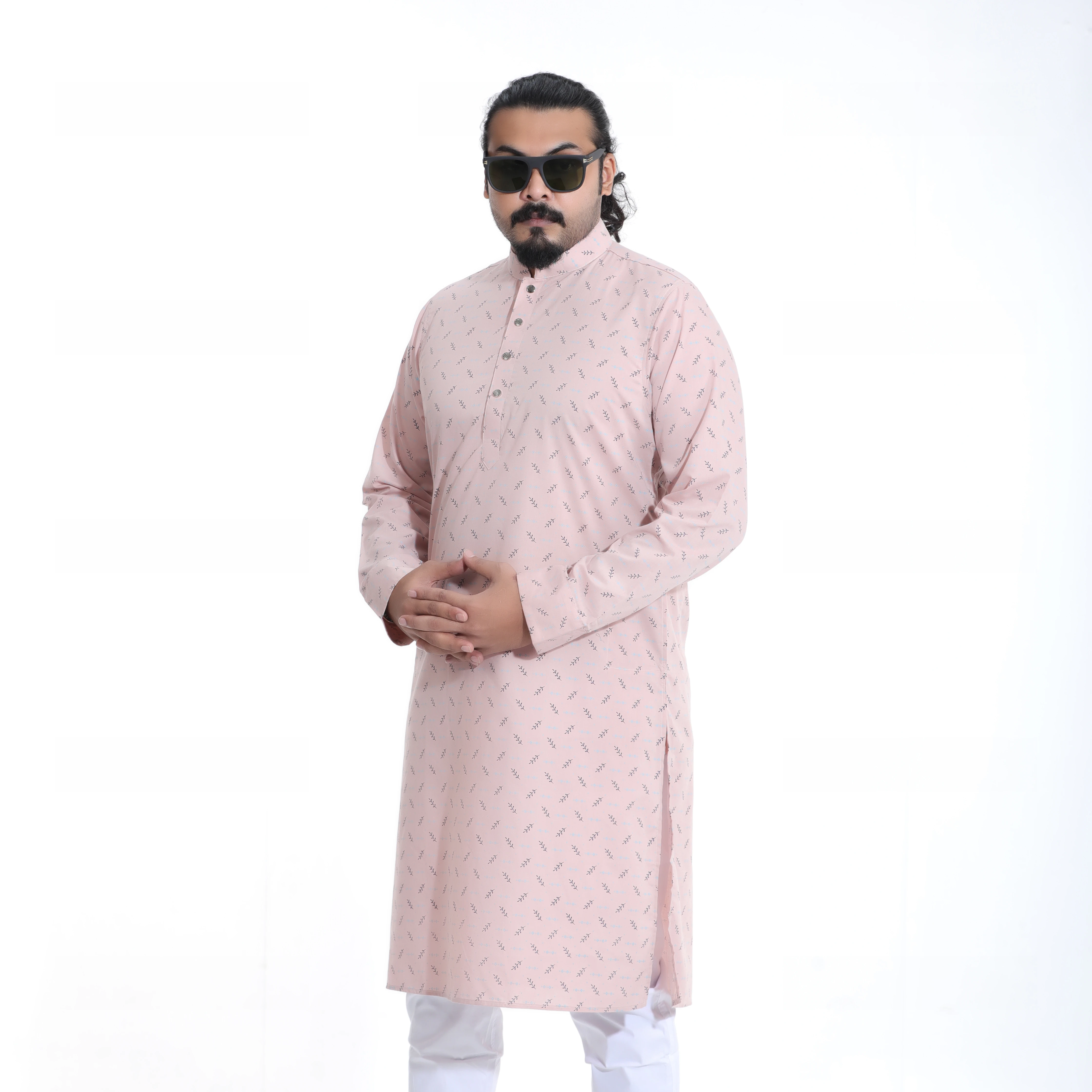 "Step out in sophisticated style with our Men's Baby Pink Printed Casual cotton panjabi. This elegant full-sleeve Panjabi features a subtle, all-over abstract print on a soft light pink fabric, offering a modern twist on traditional wear. Crafted from comfortable and breathable material, it's perfect for both casual outings and festive occasions. The classic band collar and button placket complete the refined look.