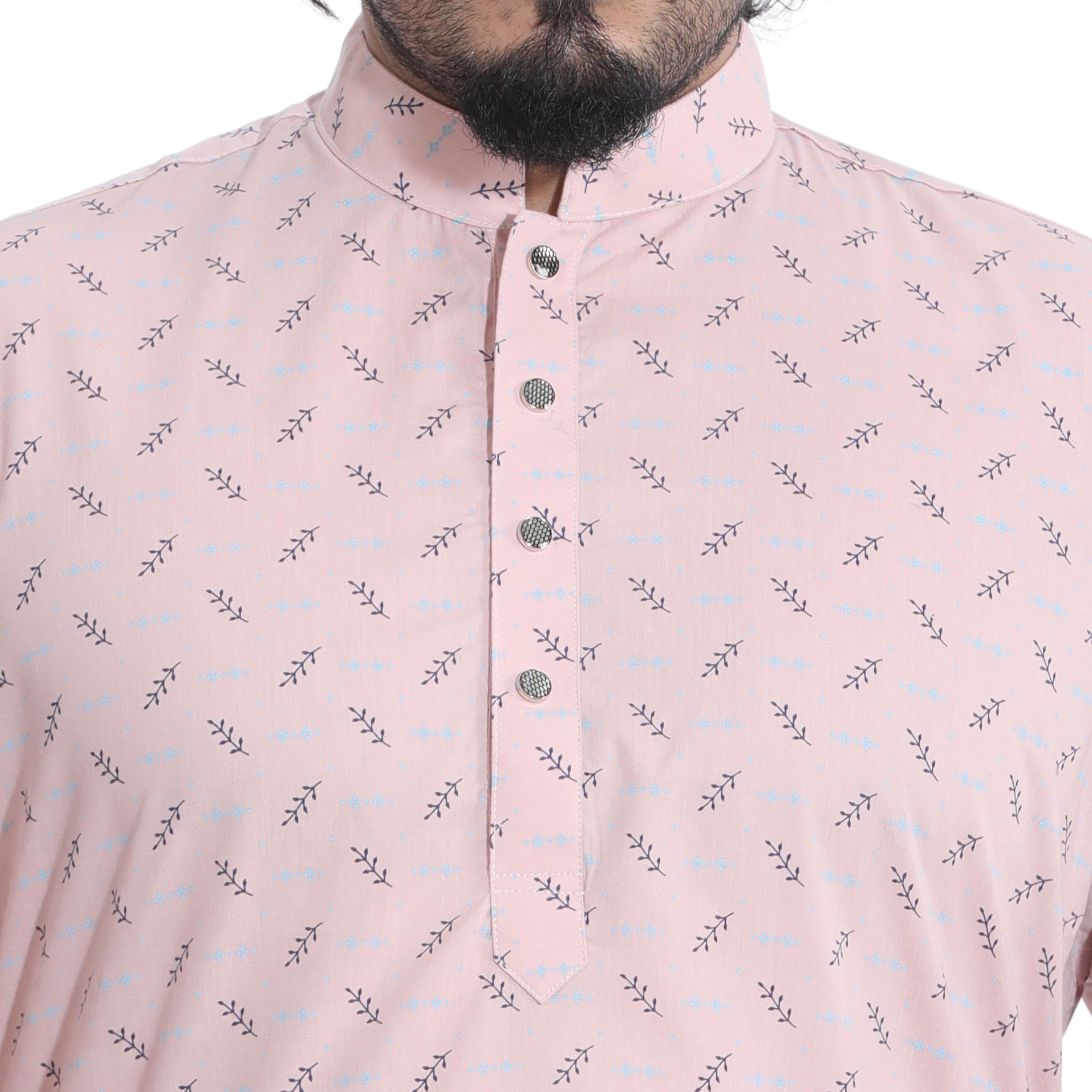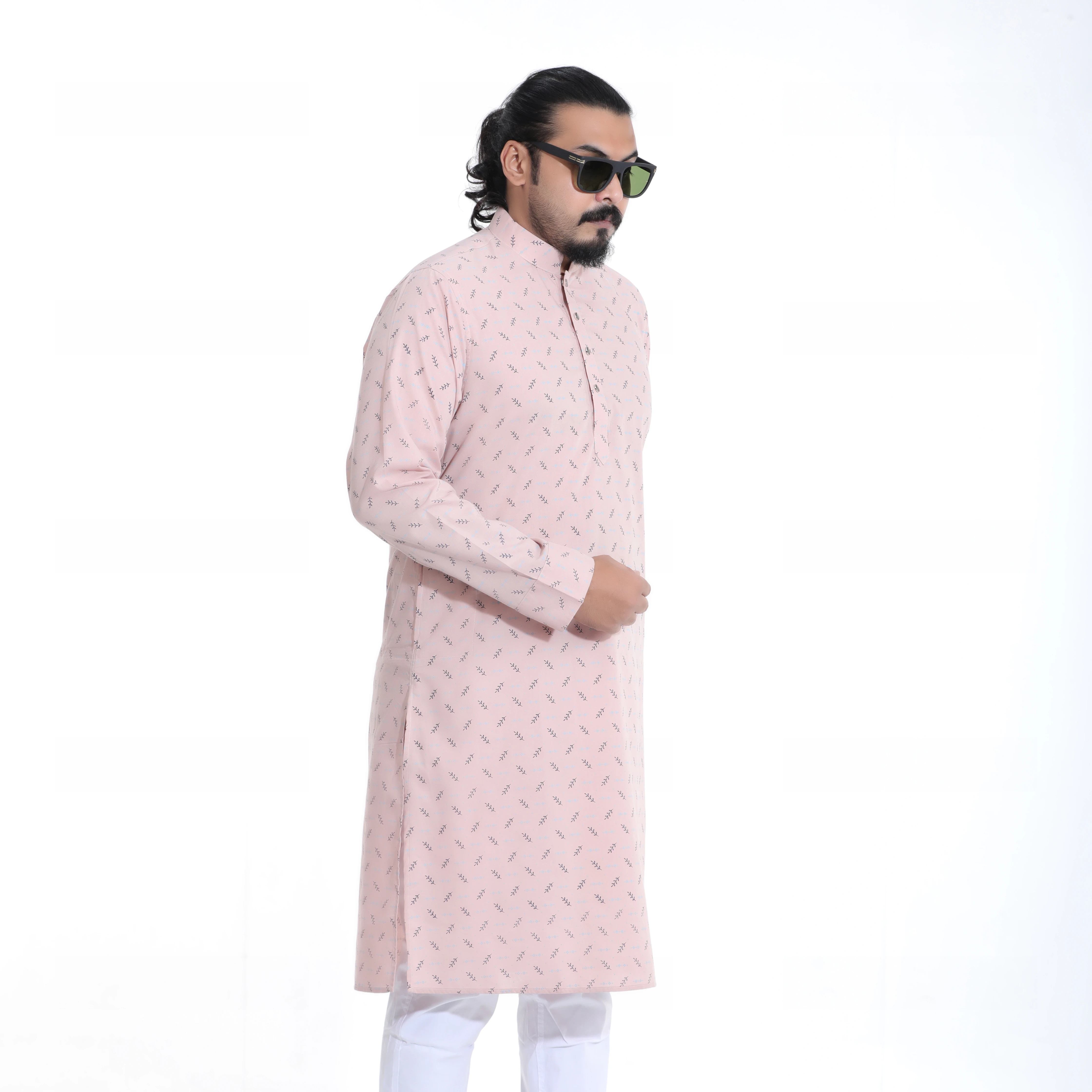 Men's Baby Pink Printed Casual Cotton Panjabi. Features in-seam side pockets.