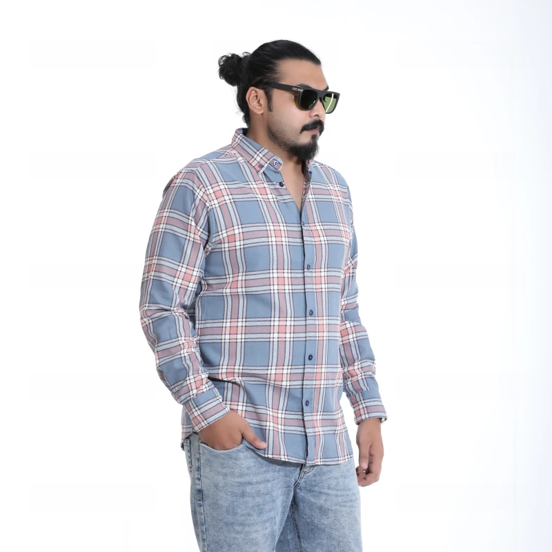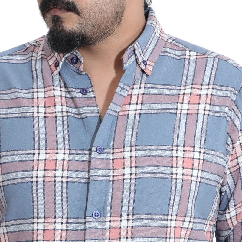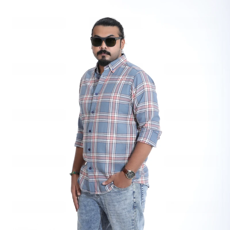 This eye-catching long-sleeve checkered shirt offers a modern and colorful twist on the classic plaid pattern. Featuring a balanced mix of slate blue, white, and soft pink/coral squares, it’s a versatile piece that brightens any casual outfit. The button-down collar gives it a neat, smart-casual finish.