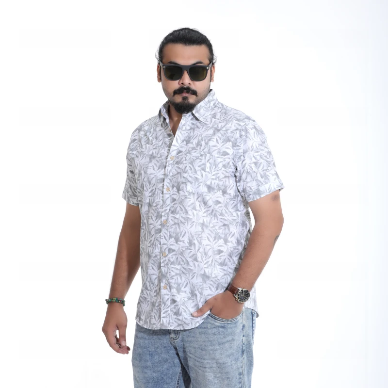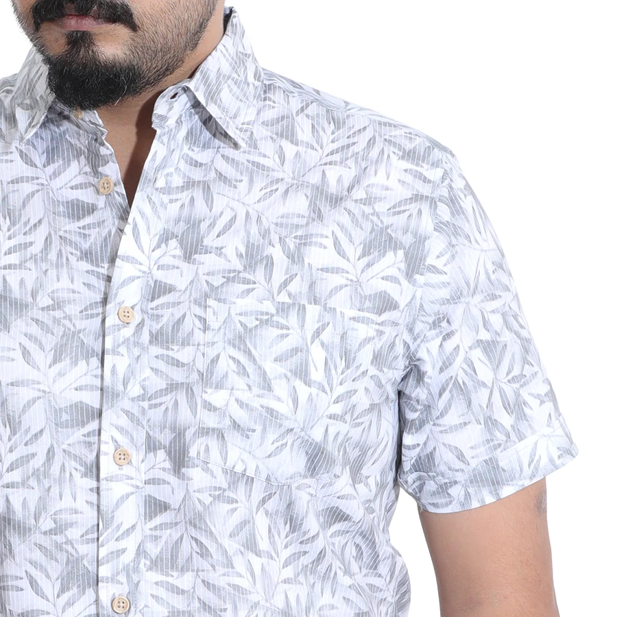 Step into the season with this stylish and breezy short-sleeve printed shirt. Featuring a modern leaf or tropical pattern in shades of white and grey, this button-down shirt is the perfect way to add a fresh, casual look to your wardrobe. Made from a lightweight and breathable fabric, it's designed for all-day comfort. Pair it with jeans or shorts for a relaxed weekend look or a stylish vacation outfit.