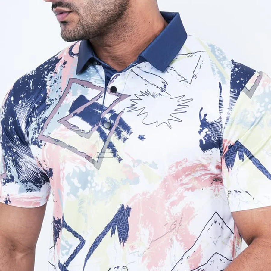 "Redefine your casual wardrobe with our Men's Abstract Brushstroke Print Polo T-Shirt. This stylish polo features a unique, modern abstract pattern in a blend of earthy tones like rust, light blue, peach, and white, making it a standout piece. Crafted from a comfortable, breathable fabric, it's perfect for all-day wear, whether you're hitting the golf course, meeting friends, or just enjoying a relaxed day out. The classic polo collar in a contrasting peach/pink hue adds a sophisticated touch.