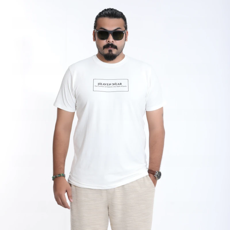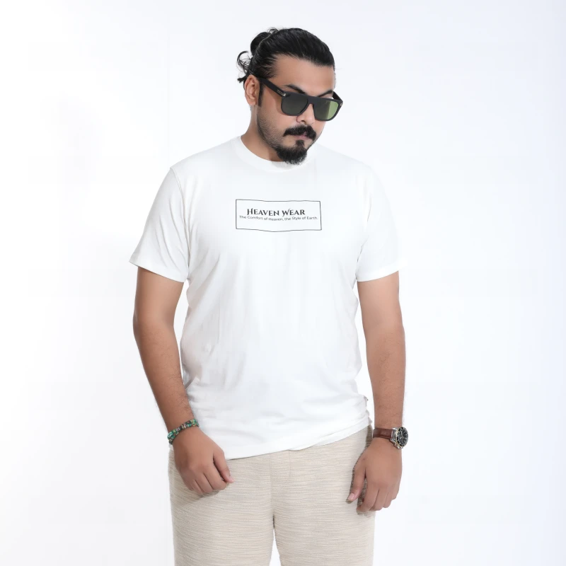 Achieve a clean, contemporary look with this minimalist white graphic T-shirt. Made from soft, breathable cotton, this tee ensures all-day comfort. The classic crew neck and short sleeves are highlighted by a subtle, boxed text print on the chest, featuring "HEAVEN WEAR" for a touch of refined branding.