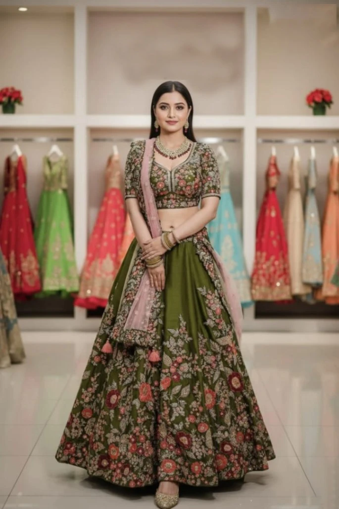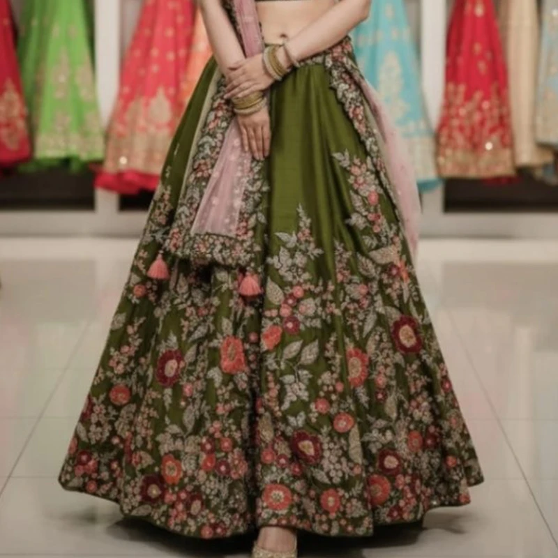 Adorn yourself in this captivating olive green lehenga choli, a perfect blend of tradition and contemporary style, ideal for weddings, receptions, and grand festivities. This stunning outfit showcases intricate multi-color floral embroidery that beautifully covers the entire flared skirt and perfectly matched blouse, highlighting its rich detailing. The unique olive green base is elegantly offset by a delicate blush pink net dupatta, adding a soft and enchanting contrast. Designed for a graceful silhouette and luxurious appeal, this lehenga ensures you exude charm and sophistication at any special occasion.