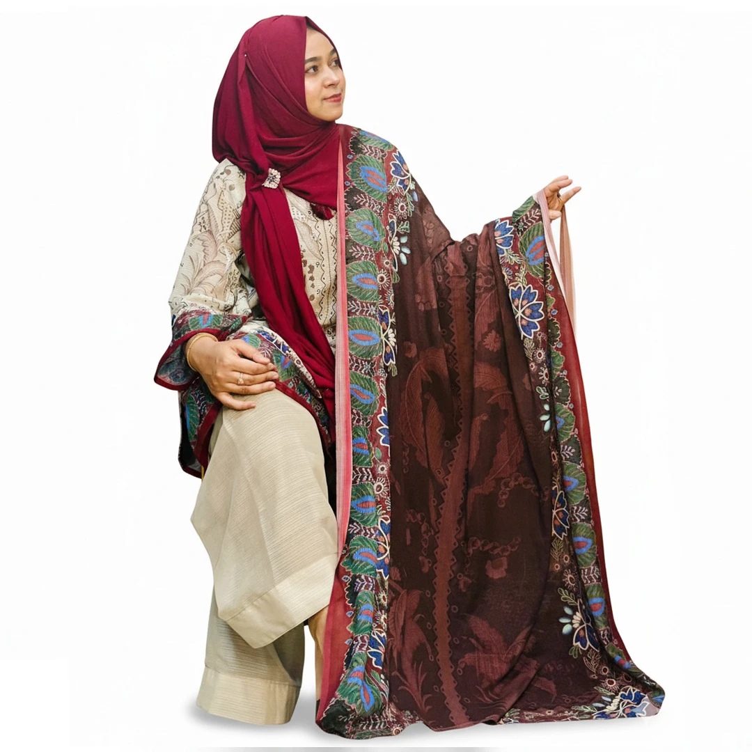 Luxurious beige colour pure chikankari chiffon kamiz with half attached body inner, chinon farshi style pant and coffee brown chinon orna.