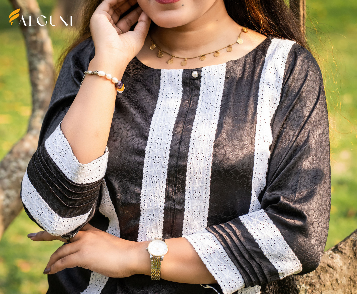 This striking black kurti is a perfect blend of modern and traditional style. The rich black fabric has a subtle, self-textured pattern that adds depth and visual interest. The standout feature is the bold white lace detailing that frames the neckline and runs down the front in two distinct stripes, creating a sophisticated and slimming effect. The three-quarter sleeves are also accented with matching white lace cuffs, tying the whole look together.