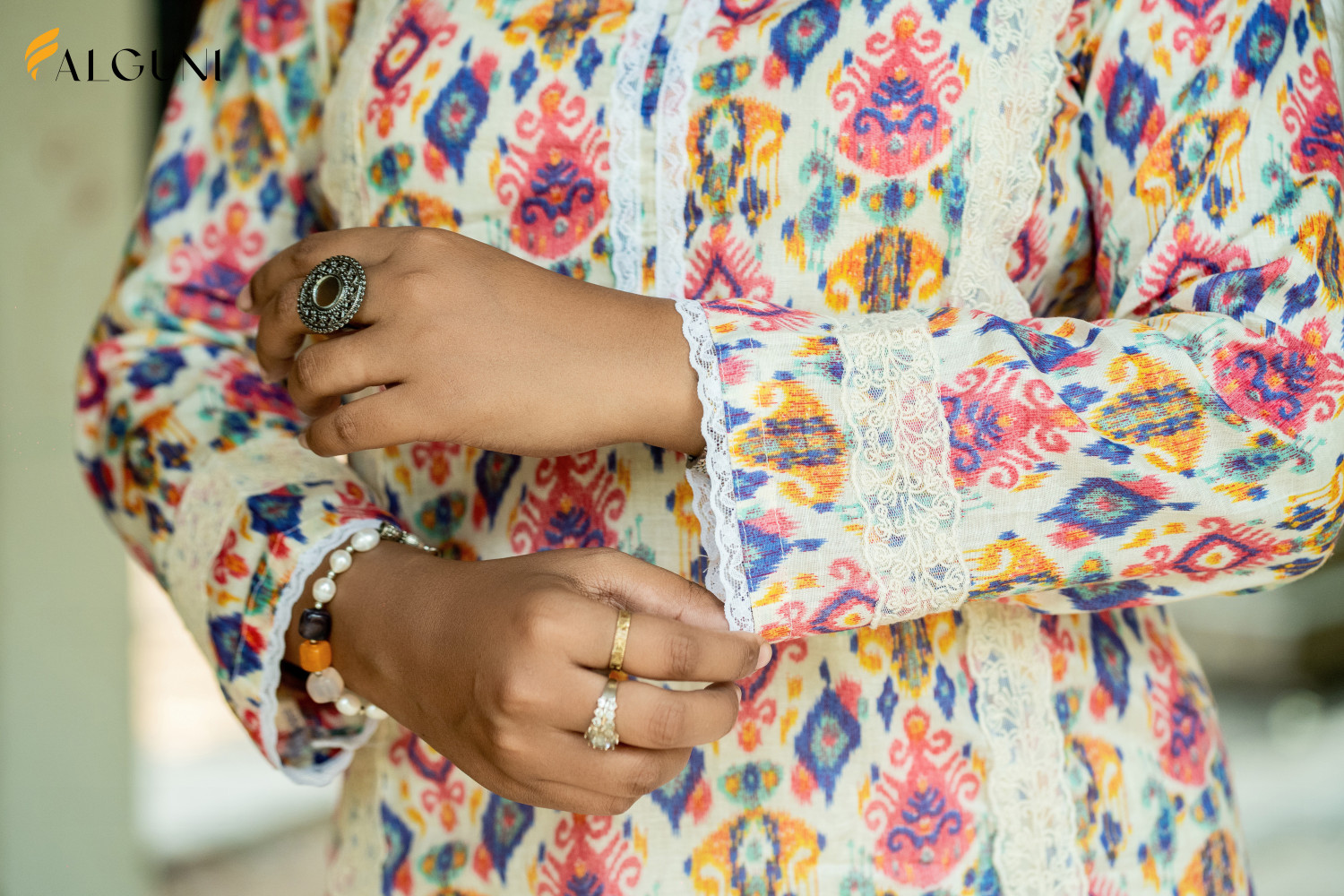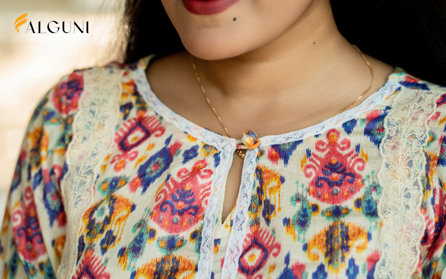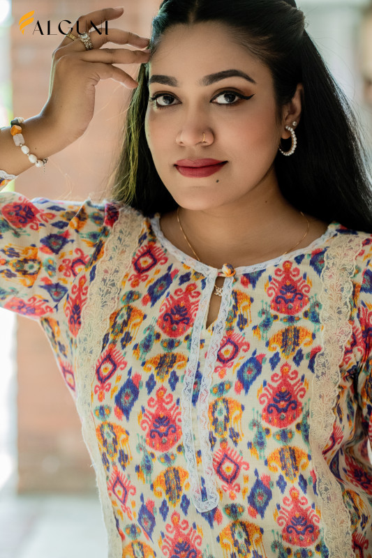 This eye-catching multicolor kurti and pant set is a celebration of vibrant style and intricate design. The entire outfit features a beautiful, dense print with shades of red, blue, pink, and yellow. The kurti is accented with elegant white lace detailing along the round neckline and running down the front of the kurti, creating a slimming and sophisticated silhouette. The sleeves and pant cuffs are also finished with matching lace trim, tying the whole look together.