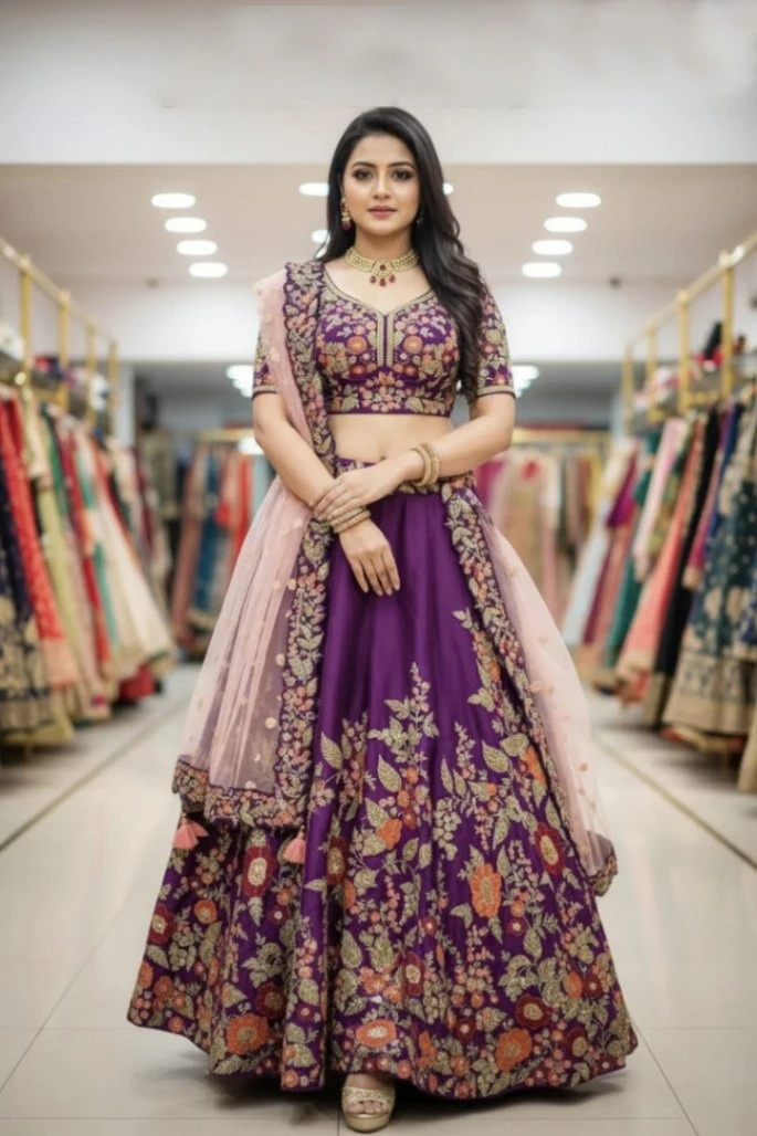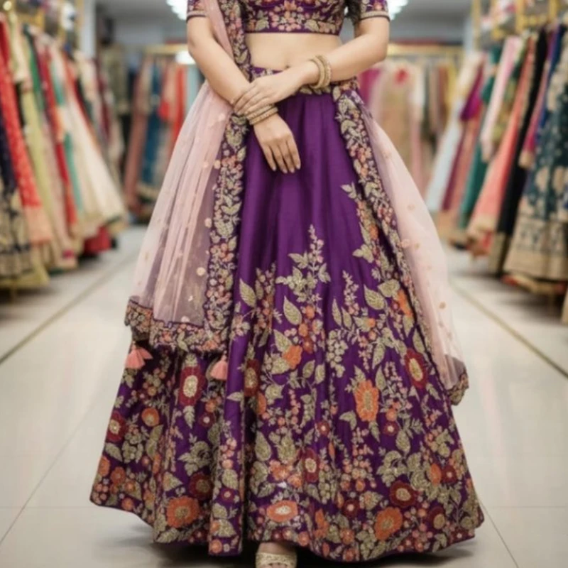 Command attention with this magnificent regal purple lehenga choli, an ideal choice for grand weddings, festive celebrations, and upscale parties. This captivating ensemble boasts exquisite multi-color floral embroidery that intricately covers the entire voluminous skirt and matching blouse, highlighting a blend of traditional artistry and modern elegance. The rich purple base is beautifully complemented by a delicate blush pink net dupatta, creating a soft yet striking contrast. Crafted for a luxurious feel and a flattering silhouette, this lehenga promises to make you shine on any special occasion.