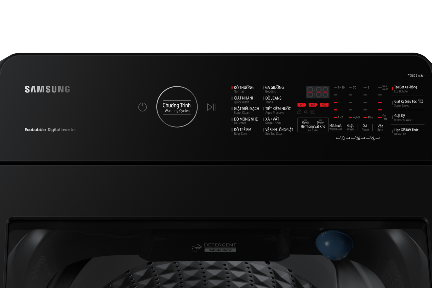 | Model Code | WA95CG4545BDSV | | Washing Capacity | Washing Capacity (kg) | 9.5 kg | | Design | Body color | Versailles Gray | | Door | Black Caviar | | Panel Display | LED | | Performance | Energy Efficiency Class | 5star | | Feature | Eco Bubble | Yes | | BubbleStorm™ | Yes | | Speed Spray™ | Yes | | Dual Storm™ | Yes | | Air Turbo | Yes | | Auto Restart | Yes | | Child Lock | Yes | | Delay End | Yes | | Drum type | 2nd Diamond | | Intensive Wash | Yes | | Magic Filter | Yes | | Motor | DIT | | Pulsator | PP Dual Storm | | Super Speed | Yes | | Spin Speed | 700 rpm | | Smart Check | Yes | | Soft Closing Door | Yes | | Water Level | 10 Levels | | Cycle | Aqua Preserve | Yes | | Baby Care | Yes | | Bedding | Yes | | Delicates | Yes | | Eco Tub Clean | Yes | | Jeans | Yes | | Normal | Yes | | Option List | Ecobubble, SuperSpeed, Power Tub Clean, Intensive Wash, Delay End | | Quick Wash | Yes | | Rinse + Spin | Yes | | Super Clean | Yes | | Physical specification | Net Dimension (WxHxD) | 540 x 1008 x 577 mm | | Net Weight | 30 kg | | Gross Dimension (WxHxD) | 580 x 1080 x 640 mm | | Gross Weight | 34 kg | | Voltage/Frequency | 220V/50Hz |