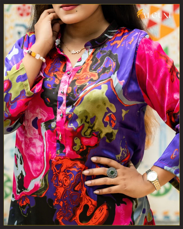 Make a striking style statement with this eye-catching T-Guni Co-Ord set, featuring a vibrant and bold abstract print. This two-piece ensemble includes a chic tunic-style top with a band collar and a partial button placket, perfectly matched with comfortable straight-leg or relaxed-fit pants. The rich mix of pink, purple, blue, and orange hues creates an artistic, fluid design that's perfect for casual outings, festive events, or adding a pop of color to your everyday wardrobe. Crafted from a smooth, lightweight fabric, this set offers both comfort and undeniable style.