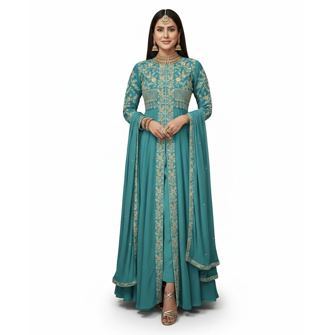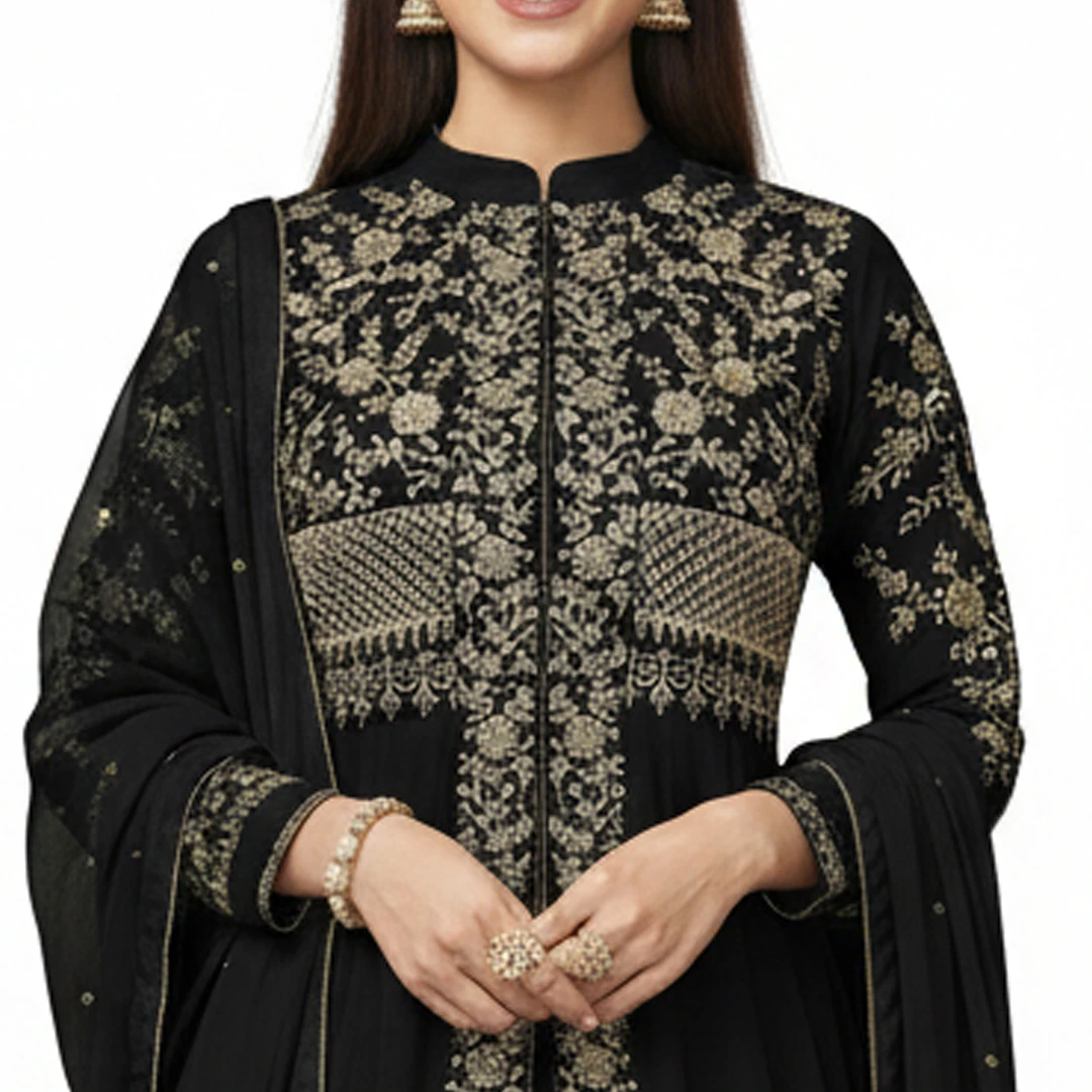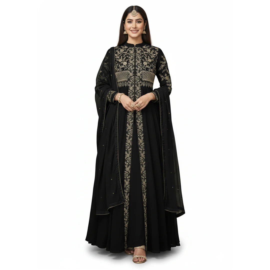 Ready Made Embroidered Georgette Long Party Dress for Women with Chiffon Dupatta